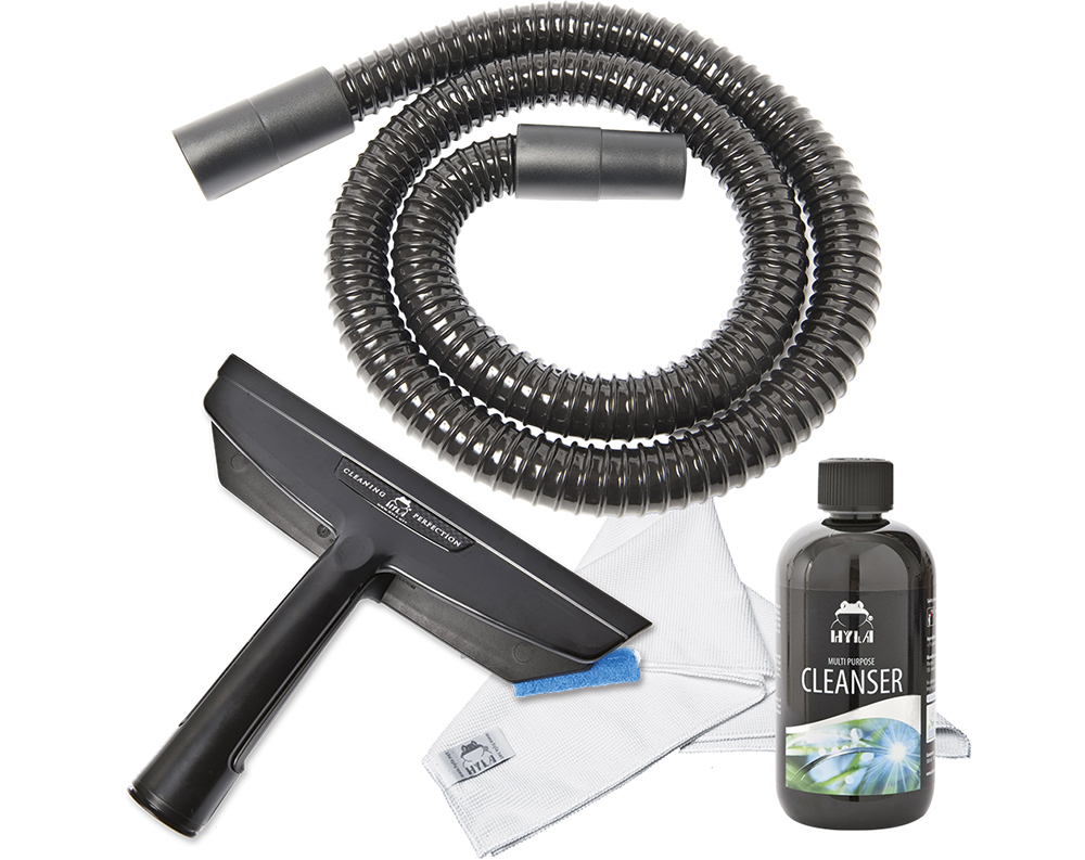 Im Set enthalten sind ein hochwertiges HYLA Microfasertuch, ein Verlängerungsschlauch und ein, mit dem ECOCert Siegel ausgezeichneten, Reinigungsmittel.